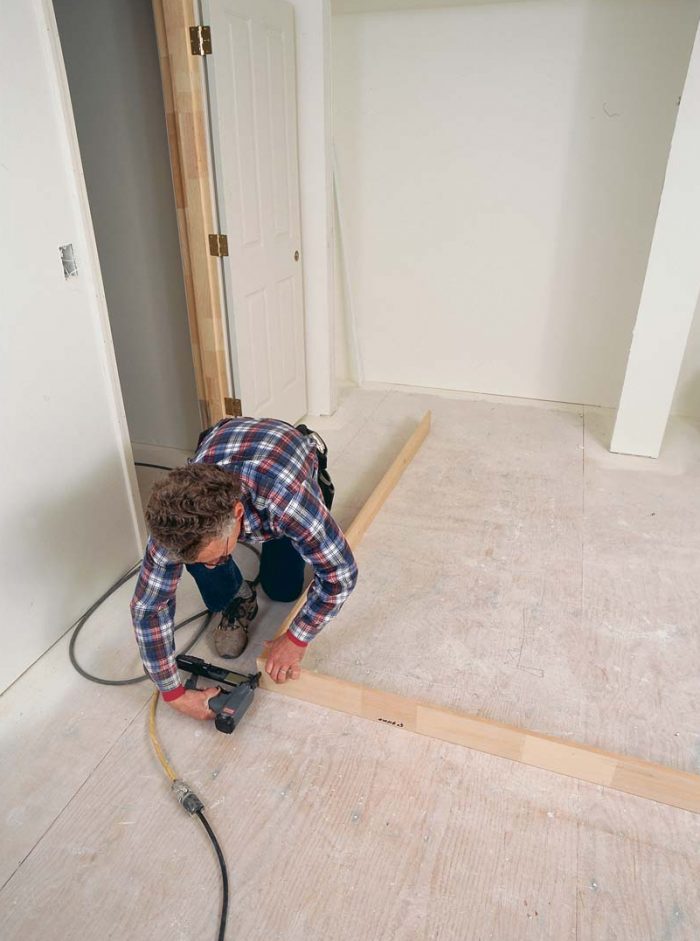 | i. Start by assembling the jamb. First, Britton spreads out the jamb parts in forepart of the closet. Then he uses a pneumatic stapler to anchor the side jamb to the caput jamb. | ii. A 1x strip hides the door runway. Once the jambs are assembled, the writer attaches a 1×ii to the inside of the caput jamb. The door track tucks against the behind of this strip. |